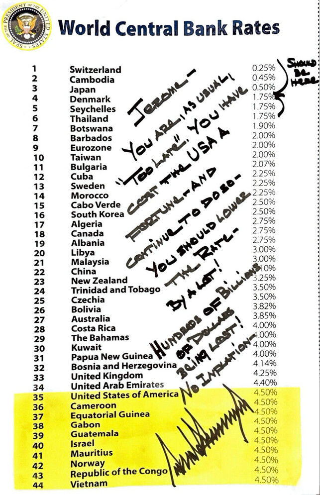 트럼프 대통령은 이날 사회관계망서비스(SNS) 트루스소셜에 세계 44개국 중 미국이 35위에 자리해있는 국가별 기준금리 순위표 위에 자필로 연준의 금리 인상을 촉구하는 메시지를 적은 이미지를 올렸다.
