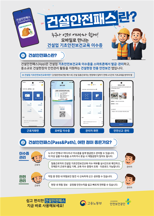 고용노동부와 한국산업안전보건공단은 1일부터 건설업 기초안전보건교육 이수 여부를 스마트폰으로 확인할 수 있는 모바일 애플리케이션 ‘건설안전패스(Pass&Path)’ 서비스를 개시한다고 밝혔다.
