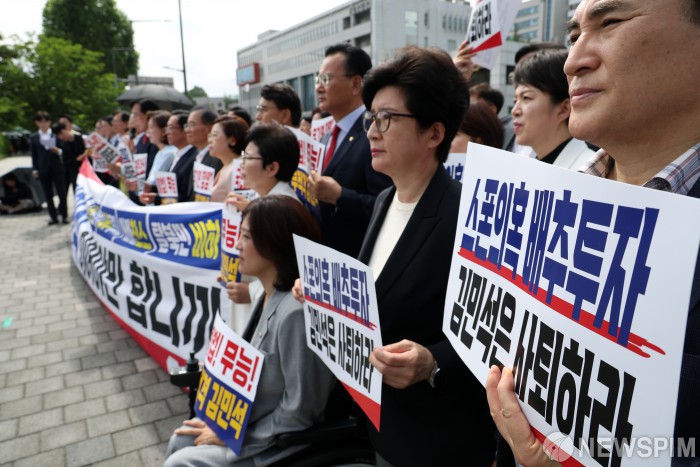 [서울=뉴스핌] 정일구 기자 = 국민의힘 의원들이 1일 오전 서울 용산구 대통령실 앞에서 열린 현장 의원총회에서 김민석 국무총리 후보자 지명 철회를 촉구하는 피켓을 들고 있다. 2025.07.01 mironj19@newspim.com