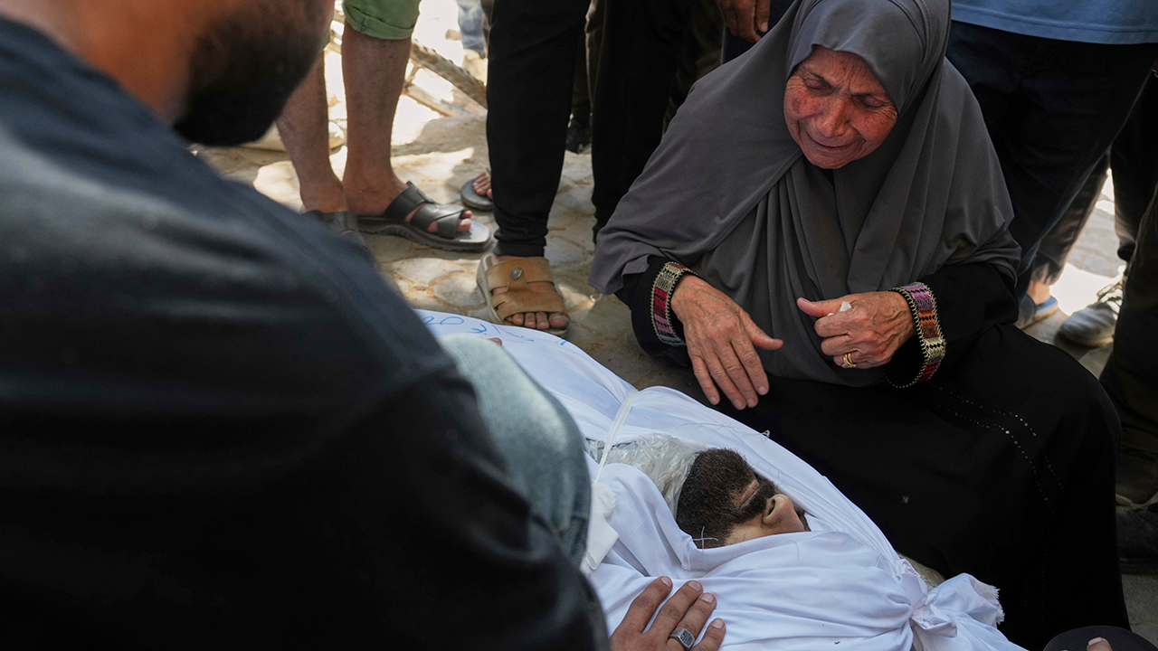 ▲ 이스라엘군의 가자시티 카페 공습으로 사망한 팔레스타인 저널리스트 이스마일 아부 하타브의 모친이 아들의 시신 옆에서 흐느끼는 모습