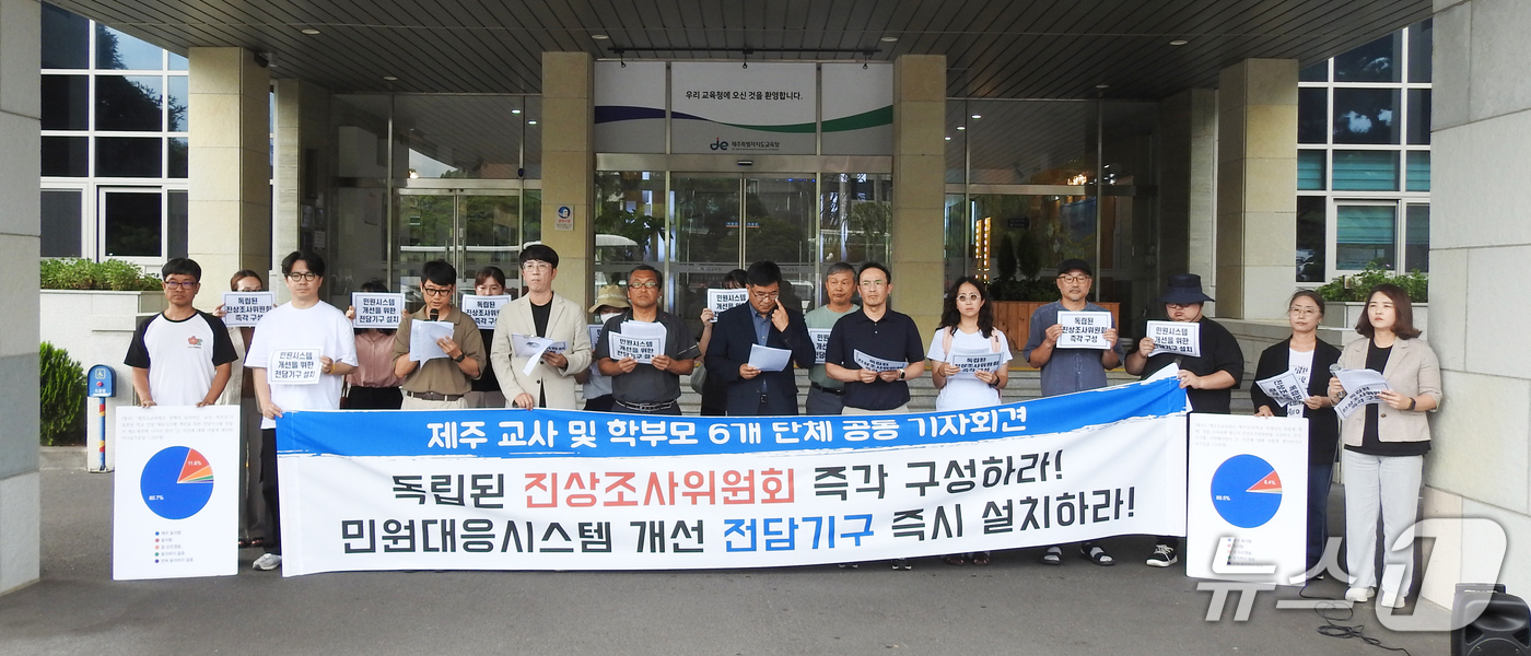 (제주=뉴스1) 오현지 기자 = 제주 교원단체와 학부모단체가 제주 중학교 교사 사망 사건과 관련해 "제주도교육청은 독립된 진상조사위원회를 구성하고, 민원대응시스템 개선 전담기구를 설치하라"고 촉구했다.