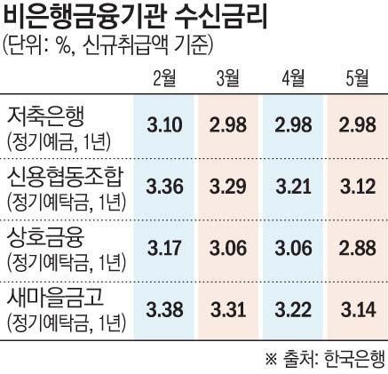 그러나 2금융권에서는 공격적으로 예금을 유치하려는 움직임이 크지 않은 상황이다. 상호금융권 관계자는 "지금 고금리 (수신)상품을 내놔도 경기가 안 좋아 운영할 데(투자처)가 없다"며 "현시점에서 (예금 확보를 위해) 수신금리를 올리는 것은 망하는 길"이라고 했다.