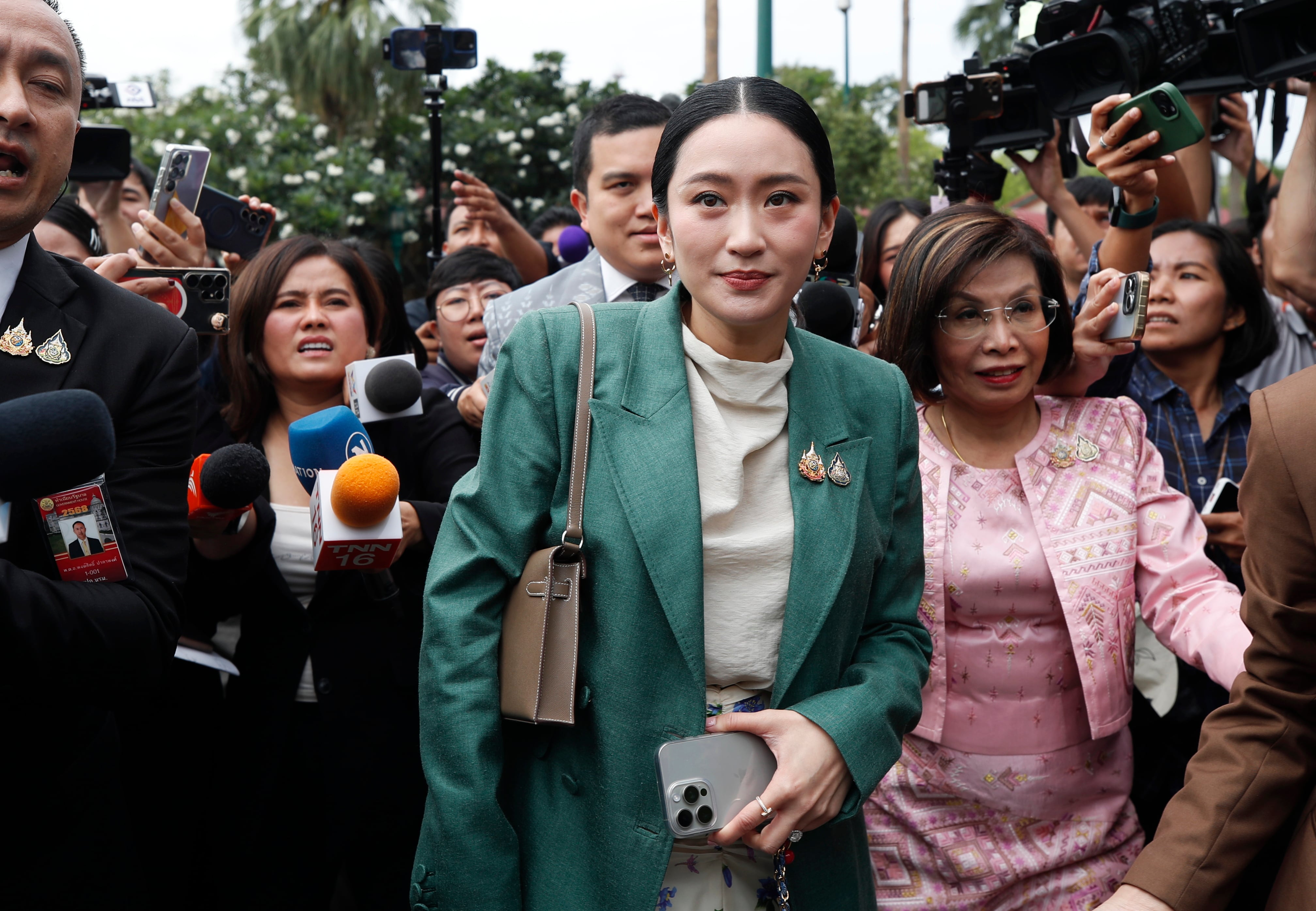 1일 내각 회의를 마친 패통탄 친나왓 태국 총리가 방콕의 태국 정부 청사에서 나오며 취재진에게 둘러싸여 있다./EPA 연합뉴스 |