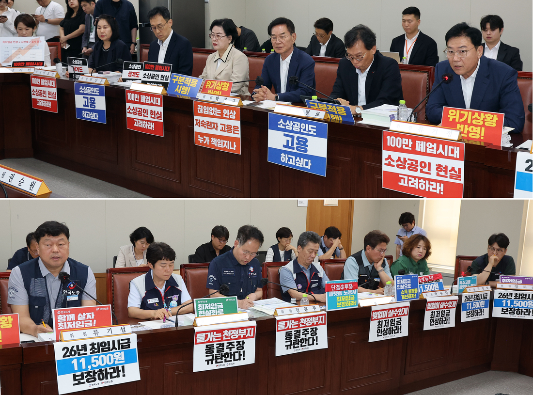 1일 정부세종청사에서 열린 최저임금위원회 8차 전원회의에서 사용자위원(사진 위)과 근로자위원(사진 아래)이 자신들의 주장이 담긴 피켓을 앞에 두고 참석하고 있다. 연합뉴스 |