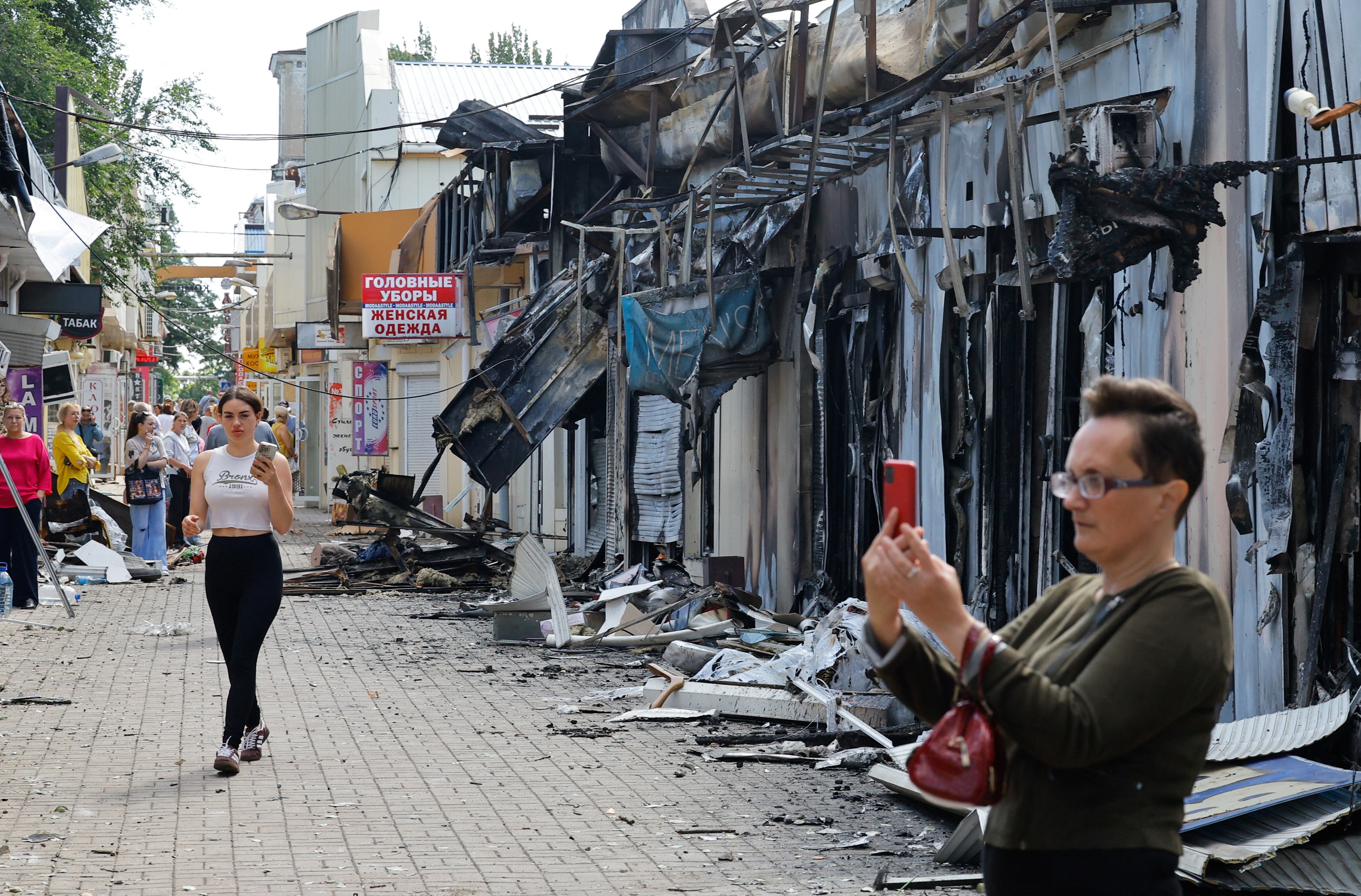 러시아 점령지인 도네츠크에서 포격을 받아 파괴된 시장에 시민들이 지나가고 있다. / 연합뉴스 |