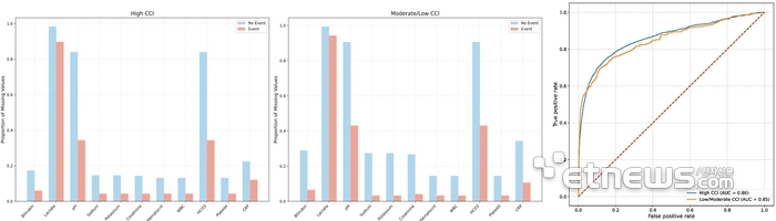 연구팀은 선행 연구를 바탕으로 환자의 중증도에 따라 수집되는 데이터와 결측률이 달라질 수 있다는 가설을 검증했다. 이에 따라 환자들을 '동반 질환 지수(CCI)' 기준으로 고위험군(CCI 〉 3)과 중저위험군(CCI ≤ 3)으로 나눈 뒤 각 집단의 데이터의 결측률과 AI 성능을 비교했다.