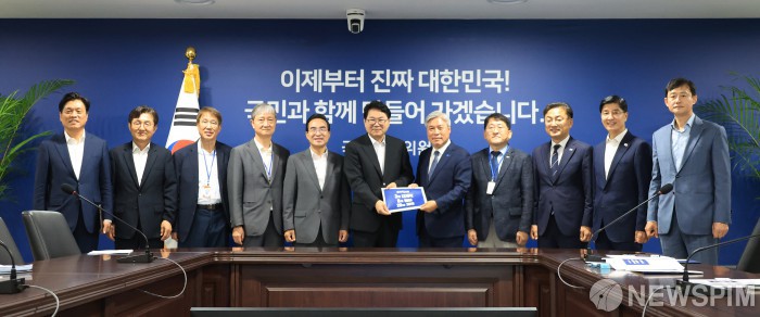 [서울=뉴스핌] 이길동 기자 = 이한주 국정기획위원회 위원장이 2일 서울 종로구 국정기획위원회에서 서왕진 조국혁신당 원내대표로부터 정책제안서를 받고 있다.2025.07.02 gdlee@newspim.com.