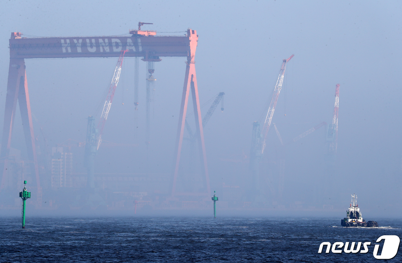 1일 오후 울산시 남구 장생포에서 바라본 현대중공업 해양사업본부 골리앗 크레인이 해무에 휩싸여 있다. 2019.8.1/뉴스1 ⓒ News1 윤일지 기자 |