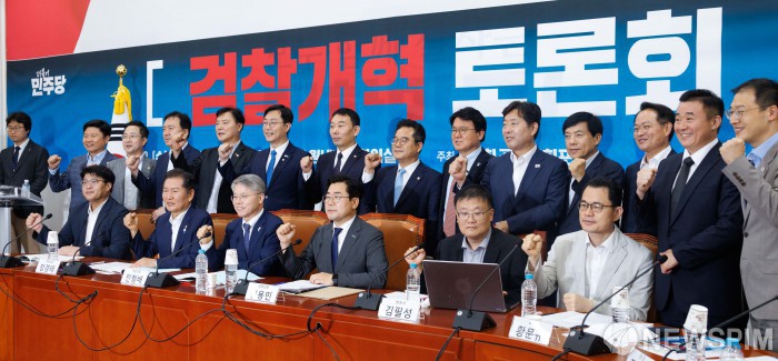 [서울=뉴스핌] 윤창빈 기자 = 민형배·김용민·장경태 더불어민주당 의원과 당대표 출마 선언을 한 정청래·박찬대 의원 등이 2일 오후 서울 여의도 국회에서 열린 검찰개혁 토론회에서 기념촬영을 하고 있다. 2025.07.02 pangbin@newspim.com