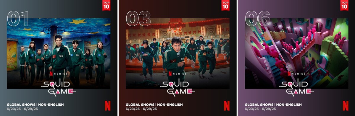 2일 넷플릭스에 따르면 공개 첫 주 모든 국가에서 1위를 기록한 넷플릭스의 첫 작품으로 ‘오징어 게임’이 대한민국 콘텐츠의 흥행 역사를 다시 썼다. 시즌 1~3은 넷플릭스 역대 최고 인기 시리즈 ‘비영어’ 부문에서 모두 10위권 안에 들었고, 시즌3 공개와 함께 이전 작을 다시 보는 이른바 ‘역주행’ 흐름으로 시즌 1과 2가 각각 비영어 부문에서 3위외 6위에 올라섰다.