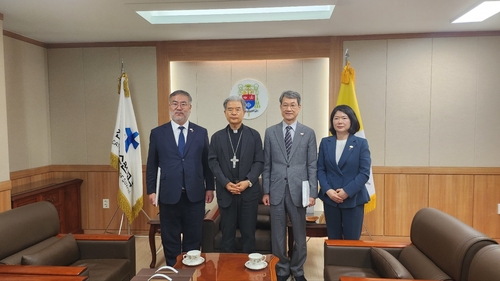 ▲ 10·29 이태원 참사 진상규명과 재발 방지를 위한 특별조사위원회는 2일 천주교 수원교구청에서 한국천주교주교회의 의장 이용훈 주교를 만나 특조위 활동에 대한 사회적 공감대 형성을 당부했다. 이번 예방은 조사개시 후 종교계와의 첫 면담으로, 송기춘 위원장과 이상철·위은진 상임위원이 참석했다. (서울=연합뉴스)