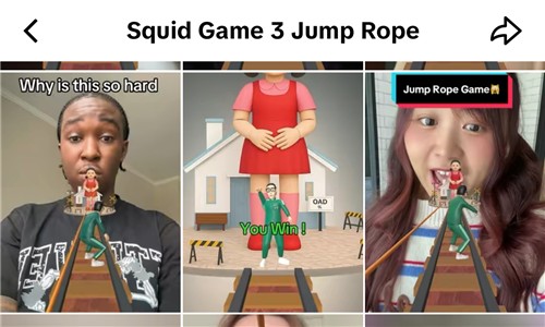 틱톡에는 '오징어 게임3 줄넘기'(Squid Game 3 Jump Rope) 게임 필터를 활용한 챌린지 영상이 쏟아진다.