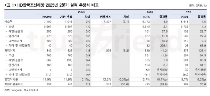 HD현대중공업의 2분기 연결 매출액은 7조 1085억원(전년 대비 7.5%↑), 영업이익은 8486억원(125.4%↑)으로 추정하며 모두 컨센서스에 부합한다고 덧붙였다.
