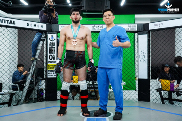 KMMA 30회 대회서 승리한 ‘블랙샤크’ 샤크 그로즈니에게 메인스폰서인 뽀빠이연합의원 김성배 대표원장이 시상하고 있다. 사진=KMMA |