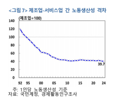 서비스 산업의 생산성이 낮은 이유는 우리나라 사회전반이 서비스를 공공재나 무상으로 제공되는 활동으로 받아들이기 때문이다. 이렇게 되면 서비스업에 대한 민간 투자는 줄어 들고, 자립적인 성장기반을 마련할 수 없다. 실제로 서비스업 투자율은 2000년 26%에서 2022년 18%로 하락했다.