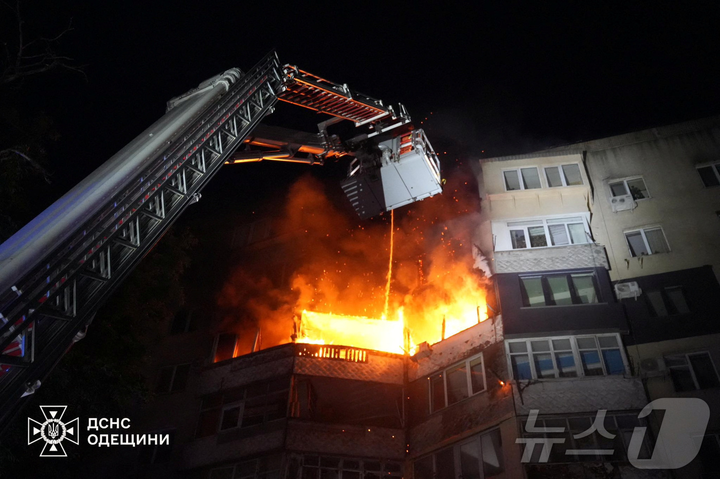 (오데사 로이터=뉴스1) 김지완 기자 = 3일(현지시간) 우크라이나 오데사에서 러시아 드론 공격을 받은 아파트에 화재가 발생해 소방관이 진화 작업을 벌이고 있다. 사진은 우크라이나 국가비상사태청 제공. 2025.07.03 ⓒ 로이터=뉴스1