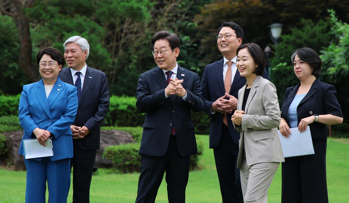 이재명 대통령과 비교섭단체 5당 지도부가 3일 한남동 대통령 관저에서 기념촬영 후 오찬장으로 이동하고 있다. 대통령통신사진기자단 |