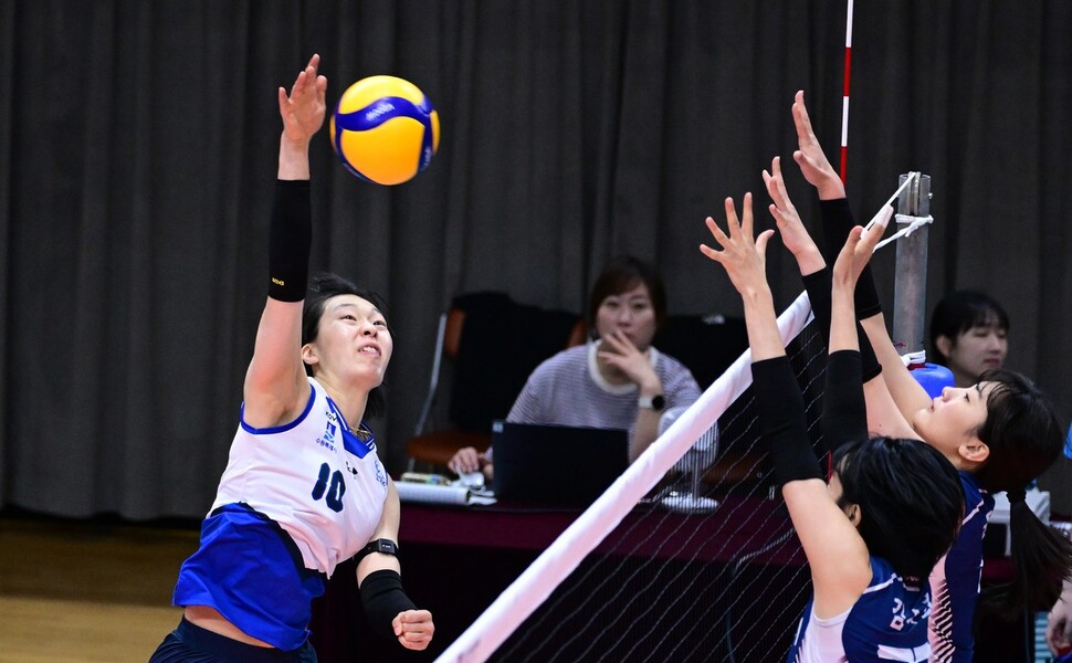 현대건설 지민경이 3일 충북 단양국민체육센터에서 열린 ‘2025 한국실업배구연맹·프로배구 퓨처스 챔프전’ 수원시청과의 경기에서 공격하고 있다. 한국배구연맹 제공 |