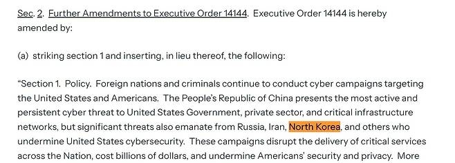 바이든 행정부 임기 끝자락인 지난 1월 16일자 행정명령에는 대미(對美) 사이버 안보 위협의 근원으로 중국만 특정돼 있었으나 이번에 북한, 러시아, 이란을 추가로 적시한 것이다.