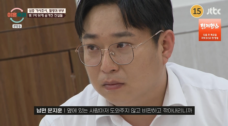 남편은 실제로 극단적인 생각까지 했다며 "금전적인 거로 힘든데, 옆에 있는 사람도 저를 비판하고 깎아내리니까, 혼자인 것 같은 느낌이 들어서 힘들었다"라고 고백했다.