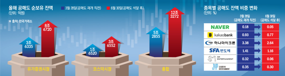 3일 한국거래소에 따르면 국내 증시에서 주식을 빌려 판 뒤 여전히 갚지 않고 보유 중인 자금을 의미하는 ‘공매도 순보유 잔액’은 지난달 30일 기준 12조3272억 원(유가증권시장 8조6720억 원·코스닥시장 3조6552억 원)으로 집계됐다. 공매도 거래가 전면 재개되기 직전인 3월 28일(5조2855억 원)과 비교하면 약 석 달 만에 2.3배 넘게 급증한 수치다.