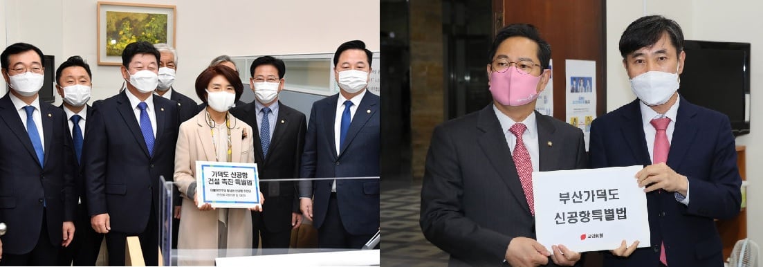 (왼쪽) 2020년 11월 26일 당시 한정애 더불어민주당 정책위의장과 부산, 울산, 경남 지역 더불어민주당 의원들이 국회 의안과에 '가덕도신공항건설촉진특별법안'을 제출하고 있다./공동취재사진(오른쪽) 2020년 11월 20일 당시 박수영, 하태경 국민의힘 의원이 국회 의안과에 부산지역 의원 15인이 공동발의한 '부산가덕도신공항특별법안'을 제출하고 있다./뉴시스 |