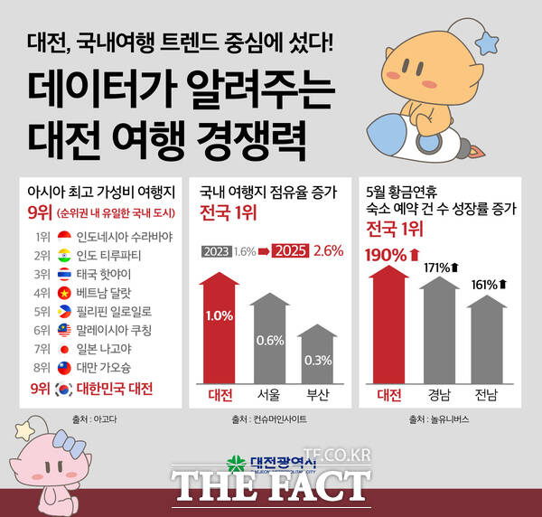 [더팩트ㅣ대전=정예준 기자] 대전시가 글로벌 여행 플랫폼 '아고다'가 발표한 '2025 아시아 최고 가성비 여행지' 순위에서 국내 도시 중 유일하게 이름을 올리며 명실상부한 관광도시로서의 위상을 입증했다.