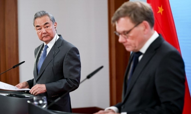 기자회견하는 왕이 중국 외교부장(왼쪽)과 요한 바데풀 독일 외무장관. EPA 연합뉴스 |