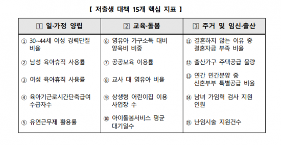 정부는 올해부터 사업 성과에 대한 평가를 강화한다. 위원회는 관계부처 협의를 거쳐 '일·가정양립', '교육·돌봄', '주거 및 임신·출산' 등 3대 분야에 걸친 저출생 대책 15대 핵심 지표를 도입했다. 이 지표와 연계해 직접사업 과제별 효과성을 분석하고, 목표 미달 과제는 재정당국과 협의해 과감한 구조조정을 예고했다.