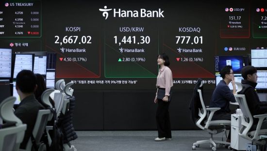 코스피가 연속 상승세를 멈추고 하락 출발한 20일 서울 중구 하나은행 딜링룸 현황판에 코스피 지수와 원/달러 환율 등이 표시되고 있다. 이날 코스피는 전장보다 0.37% 내린 2661.72에 출발했으며 서울 외환시장에서 원/달러 환율은 2원 이상 오르며 강세로 시작했다. 2025.2.20 조용준 기자 |