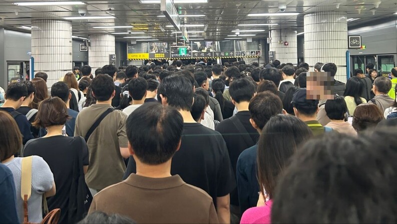 4일 오전 9시께 서울 동작구 지하철 2호선 사당역에서 시민들이 움직이지 못하는 모습. 독자 제공 |