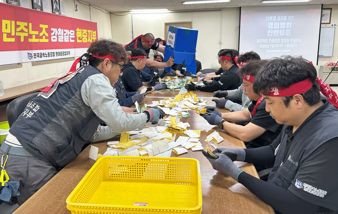 HD현대중공업 노조는 지난 2일부터 4일까지 진행한 쟁의행위(파업) 찬반투표에 전체 조합원(7539명)의 66.9%가 참여해 재적 대비 64.0%(4828명)가 찬성했다고 밝혔다.