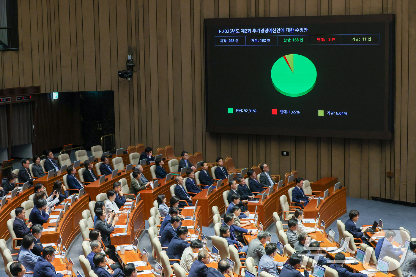 4일 오후 서울 여의도 국회에서 열린 제426회국회(임시회) 제5차 본회의에서 2025년도 제2회 추가경정예산안이 재적 298인, 재석 182인, 찬성 168인, 반대 3인, 기권 11인으로 통과되고 있다. ⓒ News1 안은나 기자 |