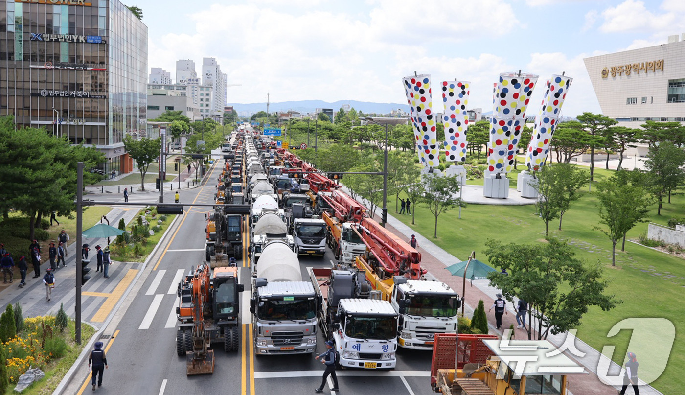 (광주=뉴스1) 박지현 기자 = 민주노총 전국건설노동조합 광주전남건설기계지부 조합원이 5일 광주시청 앞에서 총파업 투쟁을 열고 생존권 보장을 촉구하고 있다.(민주노총 제공. 재판매 및 DB 금지) 2025.7.5/뉴스1
