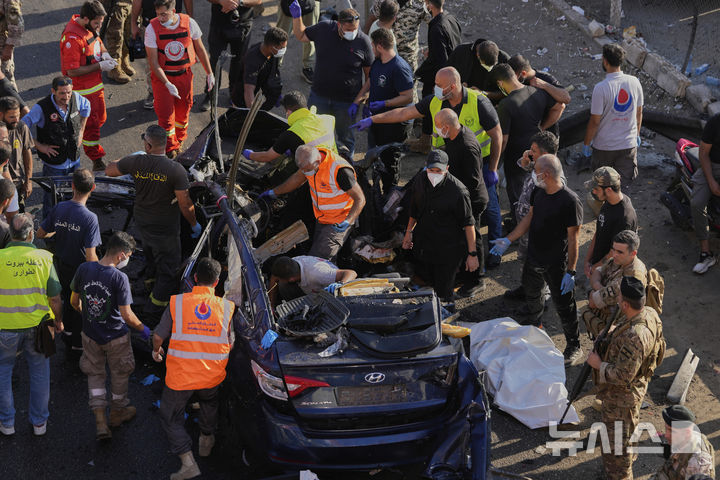 [할데=AP/뉴시스] 3일(현지 시간) 레바논 베이루트 남부 할데에서 민방위대원들이 이스라엘 드론 공습으로 파괴된 자동차에 있는 희생자 시신을 수습하고 있다. 2025.07.04 |