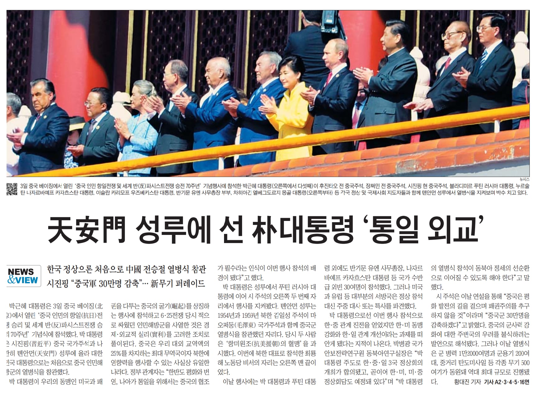 박근혜 대통령의 중국 전승절 참석을 보도한 조선일보 2015년 9월 4일자 1면 톱기사. 시진핑 주석, 푸틴 러시아 대통령의 옆에 노란색 옷을 입은 박 대통령이 보인다. |