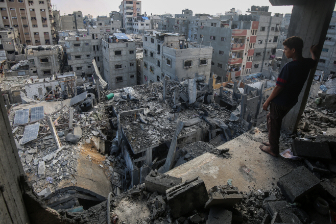 4일(현지시간) 팔레스타인 가자시티 서부 알샤티 난민 캠프에서 한 팔레스타인인이 이스라엘의 공습으로 파괴된 주택을 보고 있다./신화 연합 |