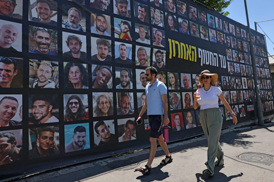 7일(현지시간) 이스라엘 수도 예루살렘에서 가자지구에 억류된 이스라엘 인질들의 초상화가 그려진 광고판 앞을 사람들이 지나가고 있다. AFP=연합뉴스 |