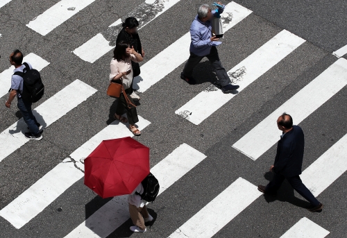 지난해 6월 서울 종로의 한 교차로 횡단보도에서 시민들이 양산과 손바닥으로 햇볕을 가린채 걷고 있다. 뉴스1 |