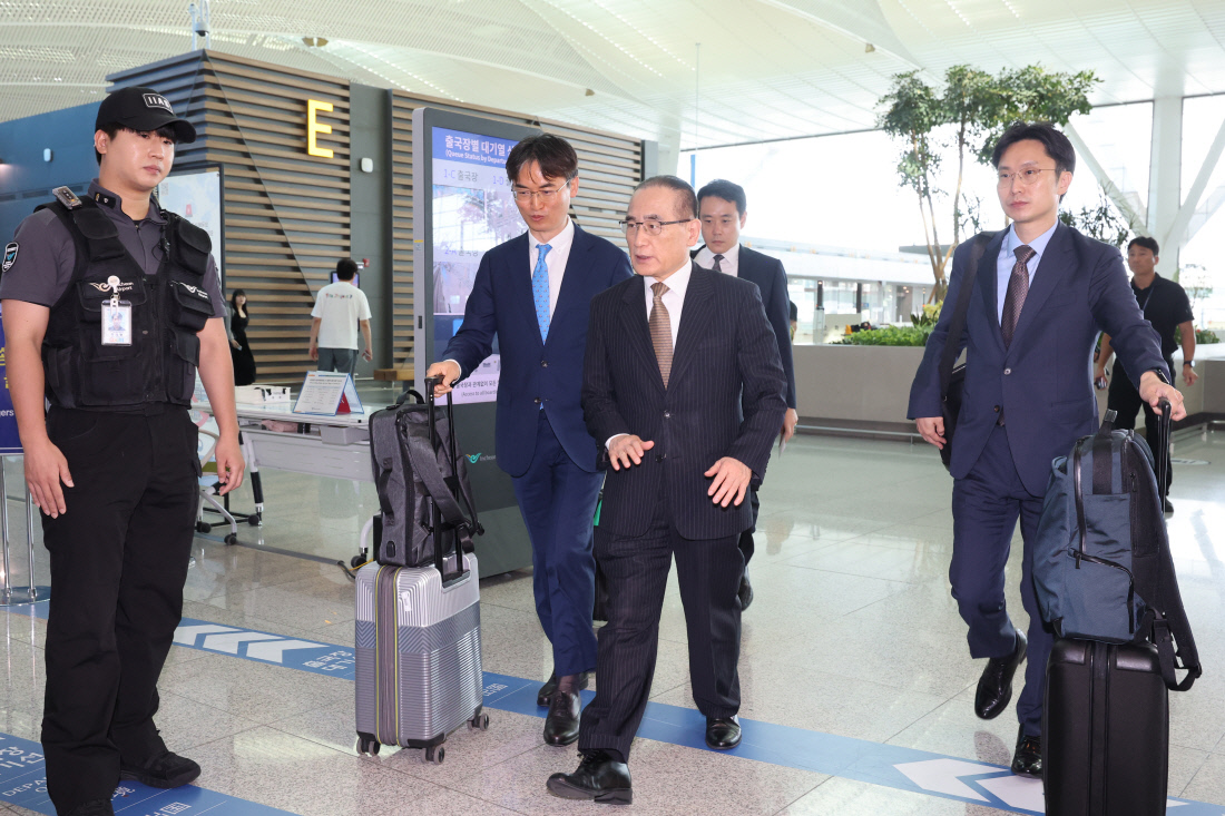 바쁜 발걸음 미국을 방문하는 위성락 국가안보실장(가운데)이 6일 인천국제공항을 통해 워싱턴으로 출국하고 있다. 연합뉴스 |