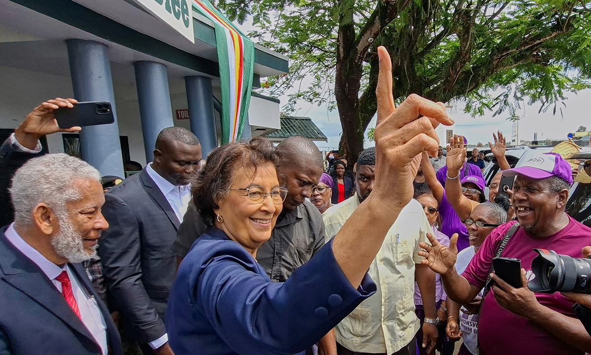6일(현지시간) 수리남 파라마리보에서 예니퍼 헤이링스 시몬스(가운데) 국민민주당(NDP) 대표가 국회에서 대통령으로 선출된 이후 지지자들의 환호에 화답하고 있다. 파라마리보=AP뉴시스 |