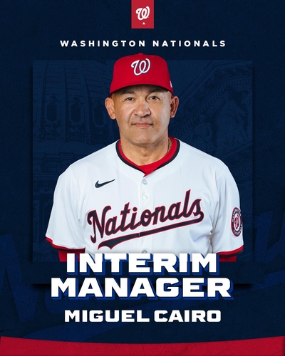 (서울=연합뉴스) 김경윤 기자 = 감독과 단장을 동시에 경질한 미국프로야구 메이저리그(MLB) 워싱턴 내셔널스는 8일(한국시간) 미겔 카이로(51) 벤치 코치를 감독 대행으로 선임했다고 발표했다.