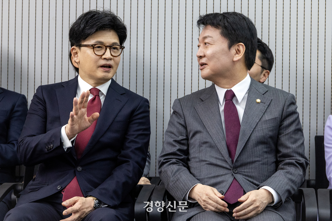 지난 4월29일 여의도 국민의힘 중앙당사에서 한동훈·안철수 당시 후보가 국민의힘 대선 경선 결선 진출자 발표를 기다리며 대화하고 있다. 국회사진기자단 |