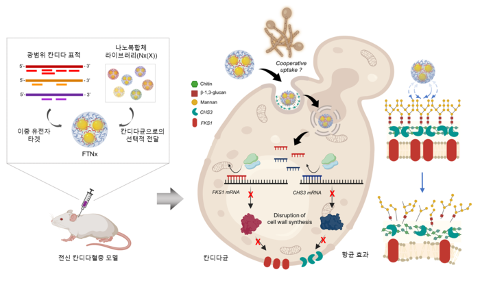 한국과학기술원(KAIST·총장 이광형)은 정현정 생명과학과 교수팀이 정용필 서울아산병원 교수팀과 협력해, 칸디다 세포벽의 두 핵심 효소를 동시에 저해하는 유전자 기반 나노치료제(FTNx)를 개발했다고 8일 밝혔다.