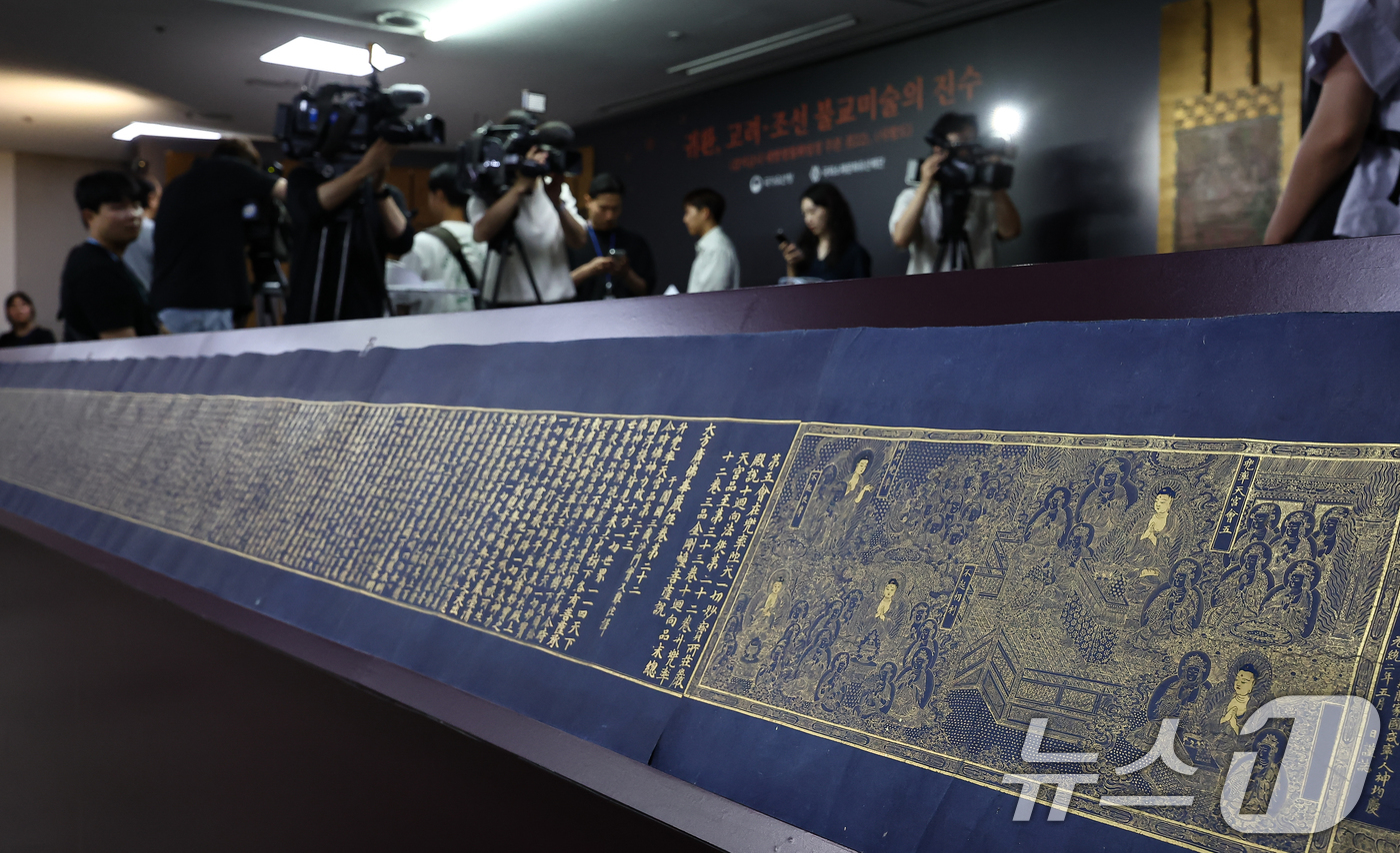 (서울=뉴스1) 김도우 기자 = 8일 서울 종로구 국립고궁박물관에서 열린 '감지금니 대방광불화엄경 주본 권22'와 '시왕도' 언론공개회에서 관계자들이 문화재를 살펴보고 있다. '감지금니 대방광불화엄경 주본 권22'와 '시왕도'는 국가유산청과 국외소재문화유산재단이 일본에서 환수한 문화재로 수백 년의 시간이 지나도 보존 상태가 양호해 향후 다양한 연구와 전시 등에 활용될 것으로 기대된다. 2025.7.8/뉴스1