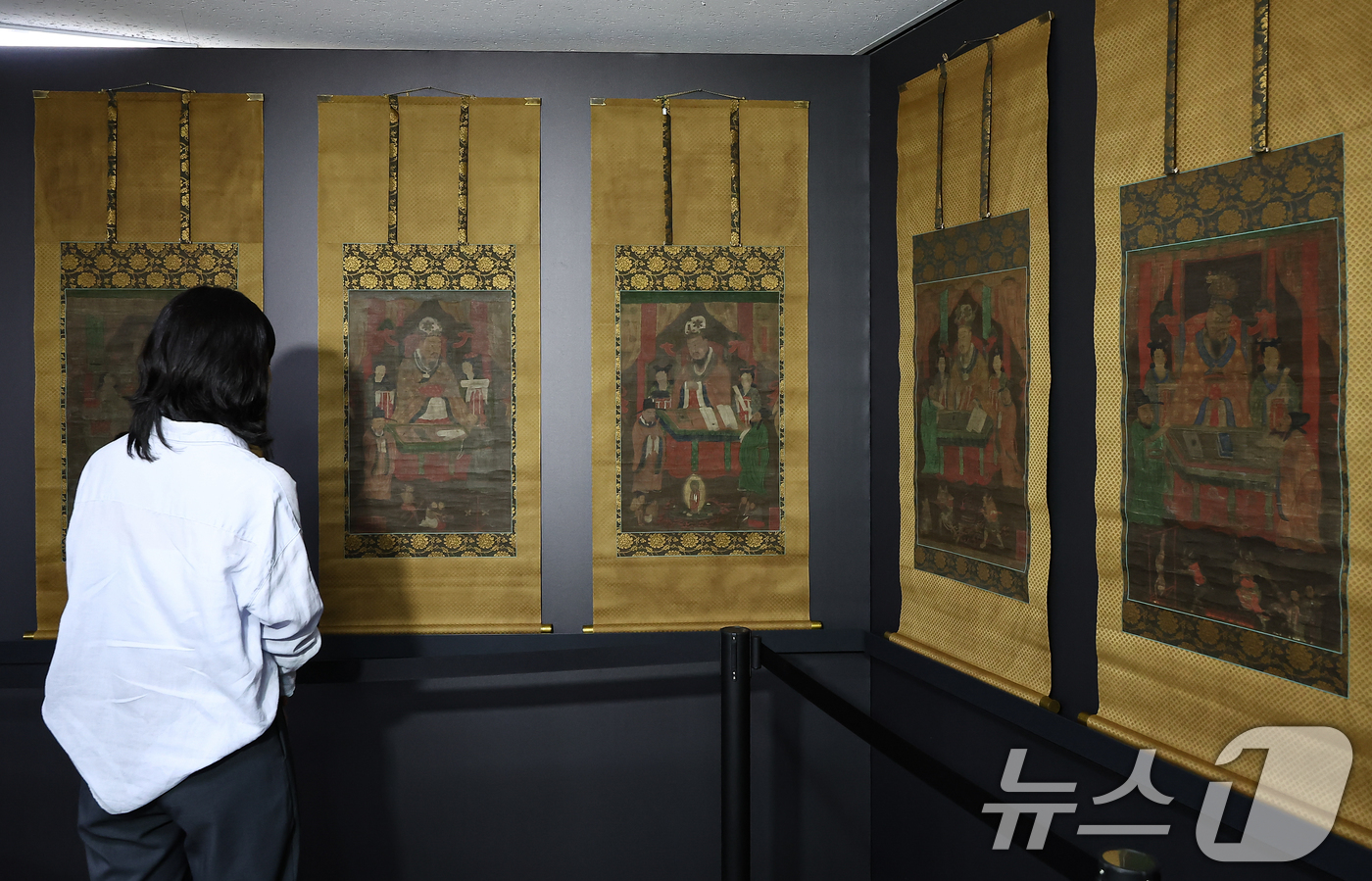(서울=뉴스1) 김도우 기자 = 8일 서울 종로구 국립고궁박물관에서 열린 '감지금니 대방광불화엄경 주본 권22'와 '시왕도' 언론공개회에서 관계자들이 문화재를 살펴보고 있다. '감지금니 대방광불화엄경 주본 권22'와 '시왕도'는 국가유산청과 국외소재문화유산재단이 일본에서 환수한 문화재로 수백 년의 시간이 지나도 보존 상태가 양호해 향후 다양한 연구와 전시 등에 활용될 것으로 기대된다. 2025.7.8/뉴스1