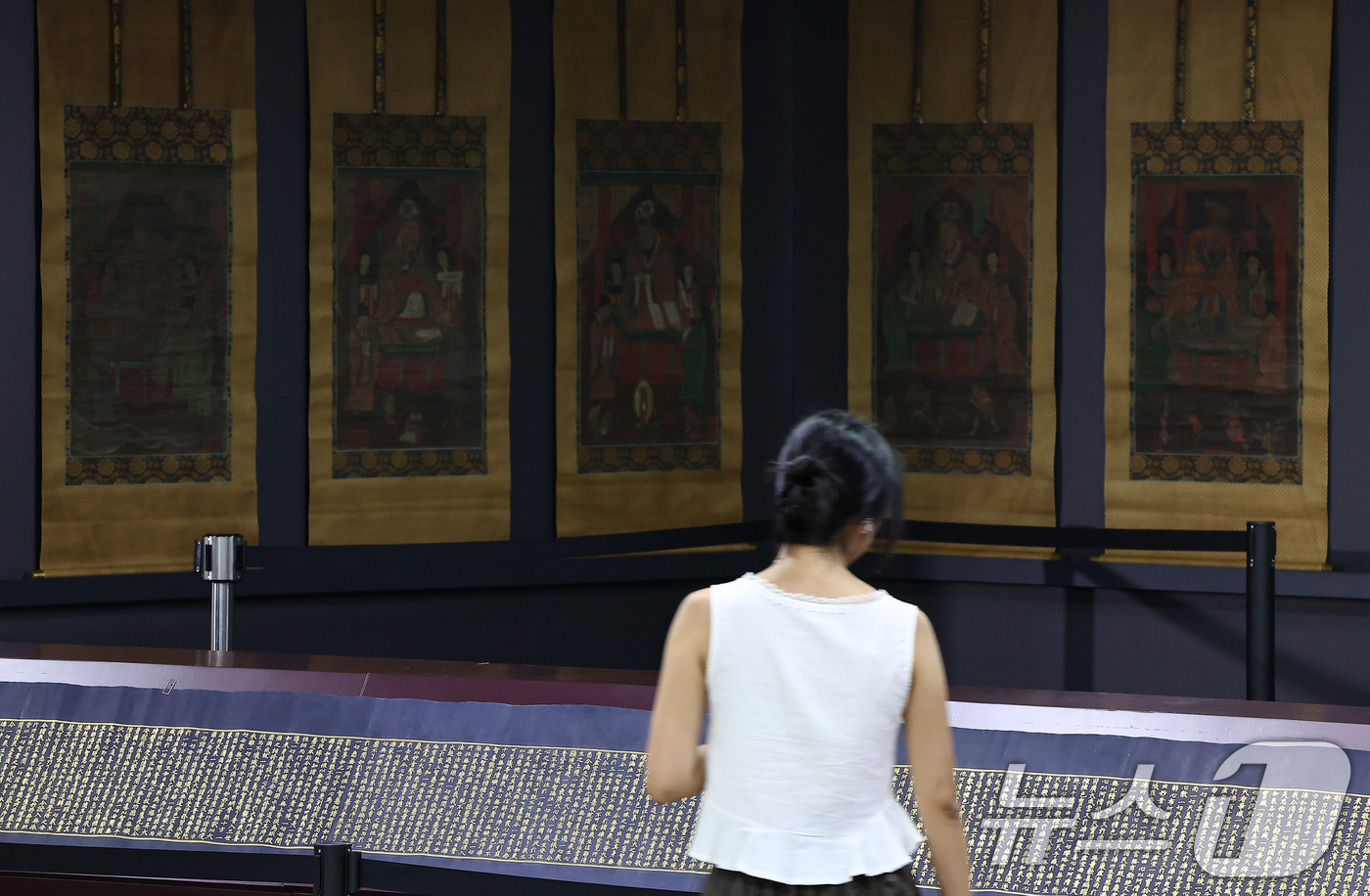 (서울=뉴스1) 김도우 기자 = 8일 서울 종로구 국립고궁박물관에서 열린 '감지금니 대방광불화엄경 주본 권22'와 '시왕도' 언론공개회에서 관계자들이 문화재를 살펴보고 있다. '감지금니 대방광불화엄경 주본 권22'와 '시왕도'는 국가유산청과 국외소재문화유산재단이 일본에서 환수한 문화재로 수백 년의 시간이 지나도 보존 상태가 양호해 향후 다양한 연구와 전시 등에 활용될 것으로 기대된다. 2025.7.8/뉴스1