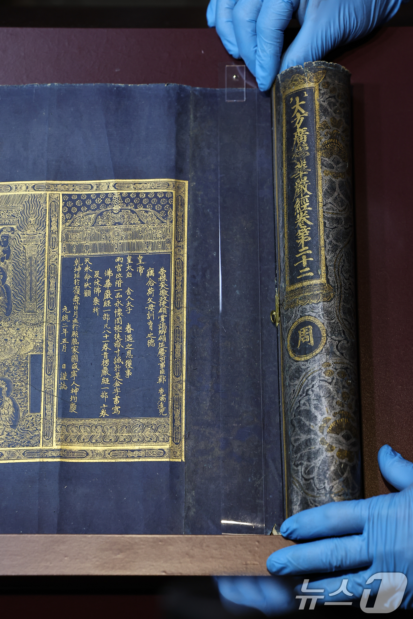 (서울=뉴스1) 김도우 기자 = 8일 서울 종로구 국립고궁박물관에서 열린 '감지금니 대방광불화엄경 주본 권22'와 '시왕도' 언론공개회에서 관계자들이 문화재를 살펴보고 있다. '감지금니 대방광불화엄경 주본 권22'와 '시왕도'는 국가유산청과 국외소재문화유산재단이 일본에서 환수한 문화재로 수백 년의 시간이 지나도 보존 상태가 양호해 향후 다양한 연구와 전시 등에 활용될 것으로 기대된다. 2025.7.8/뉴스1