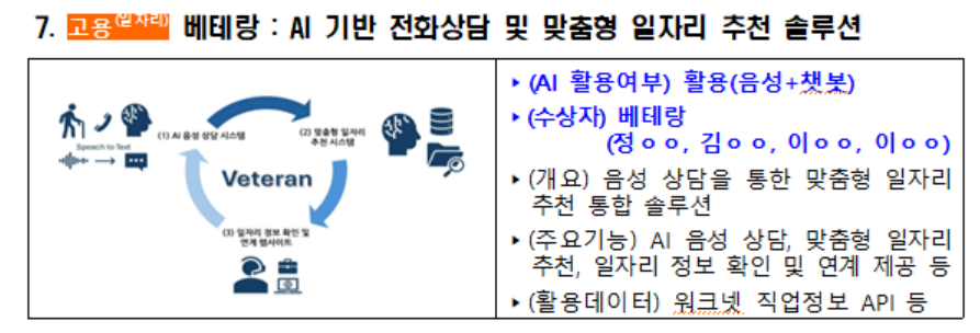 제품·서비스 개발 분야에서는 ▷AI 기반 전화상담 및 일자리 추천 솔루션 ‘베테랑’ ▷청년의 경력 공백 회복 지원 플랫폼 ‘갭로그(GapLog)’ ▷산재 대응 AI 서비스 ‘토닥(Todak)’ ▷근로계약서 분석 도구 ‘Conalyze’ ▷산학 연계를 위한 맞춤형 훈련 제안 플랫폼 ‘산학이음’ 등이 선정됐다.