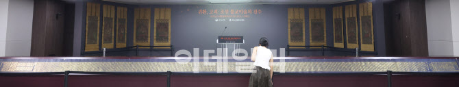 [이데일리 이영훈 기자] 8일 서울 종로구 국립고궁박물관에서 열린 '불교미술의 진수 고려 사경과 조선 불화의 귀환' 일본 환수 문화재 언론 공개 행사에서 관계자가 감지금니 대방광불화엄경 주본 권22 표지를 공개하고 있다.
